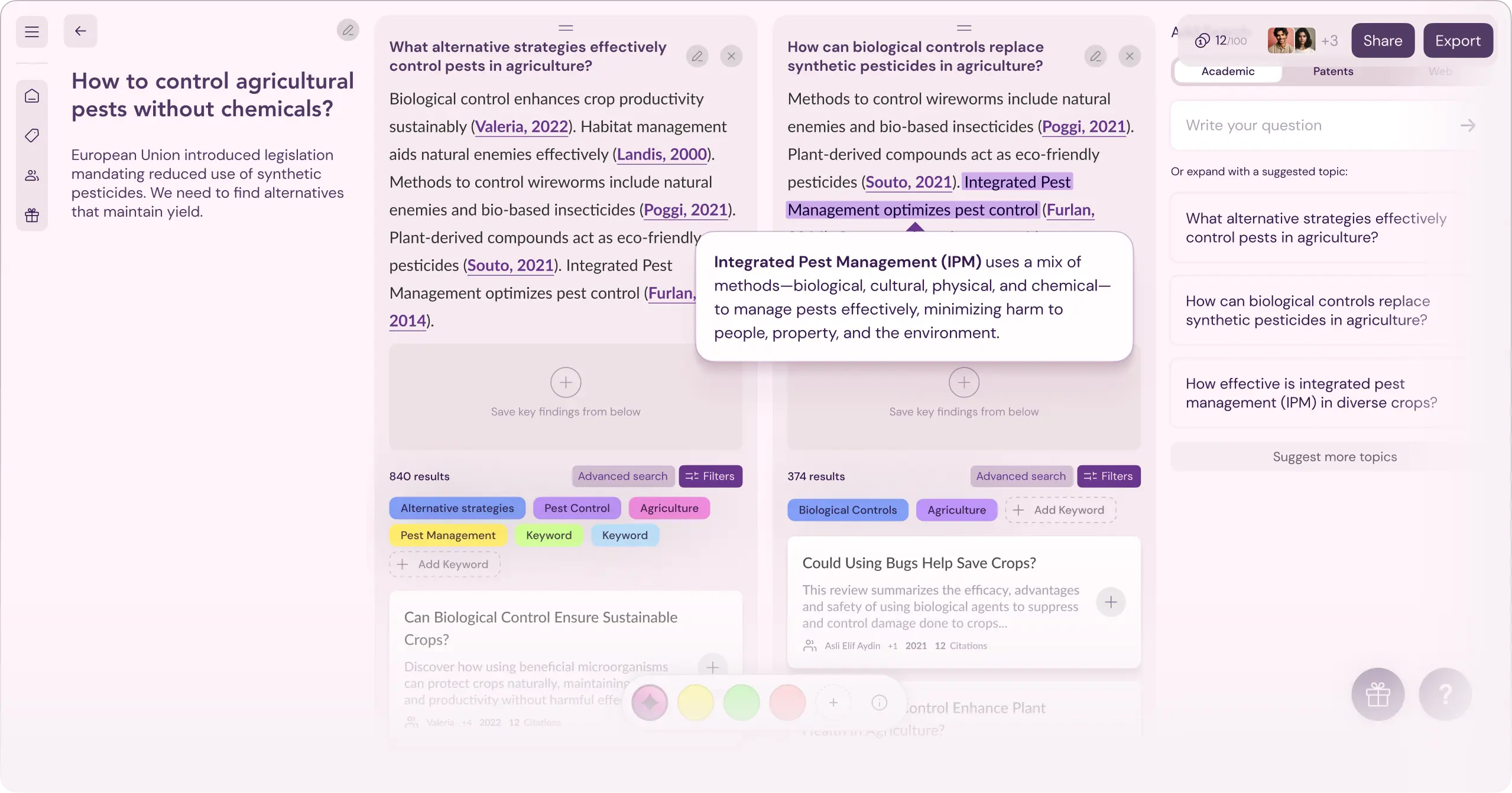Discover under-explored angles and research gaps with side-by-side search boards. See what's been studied and find topic opportunities.